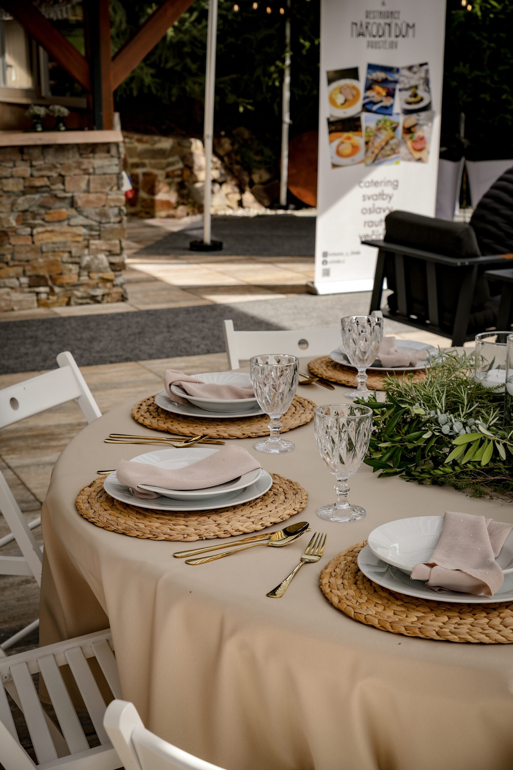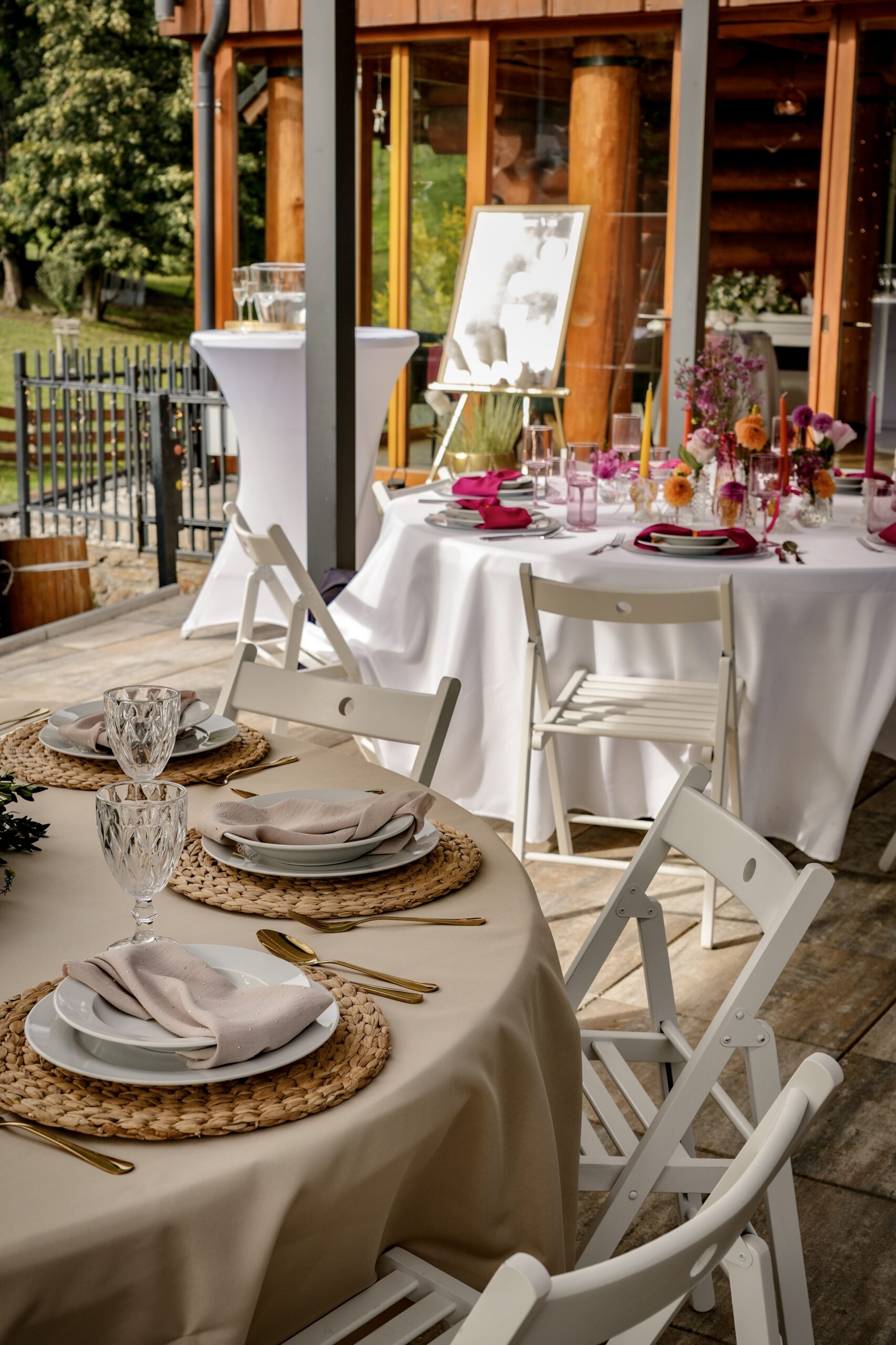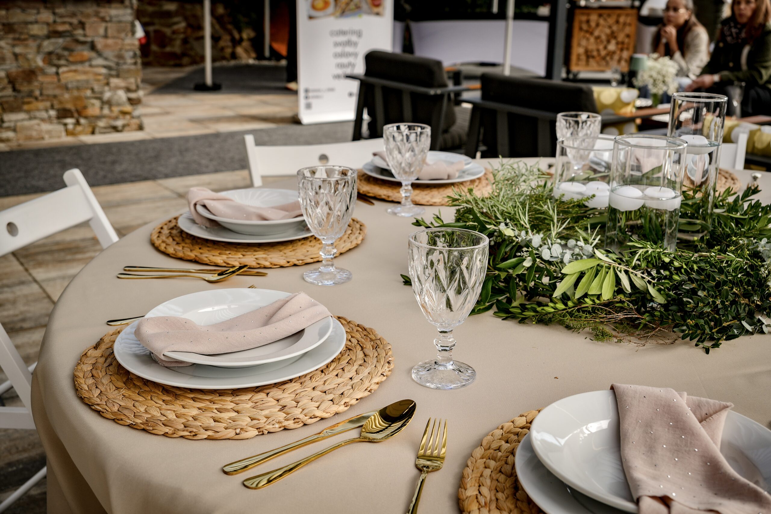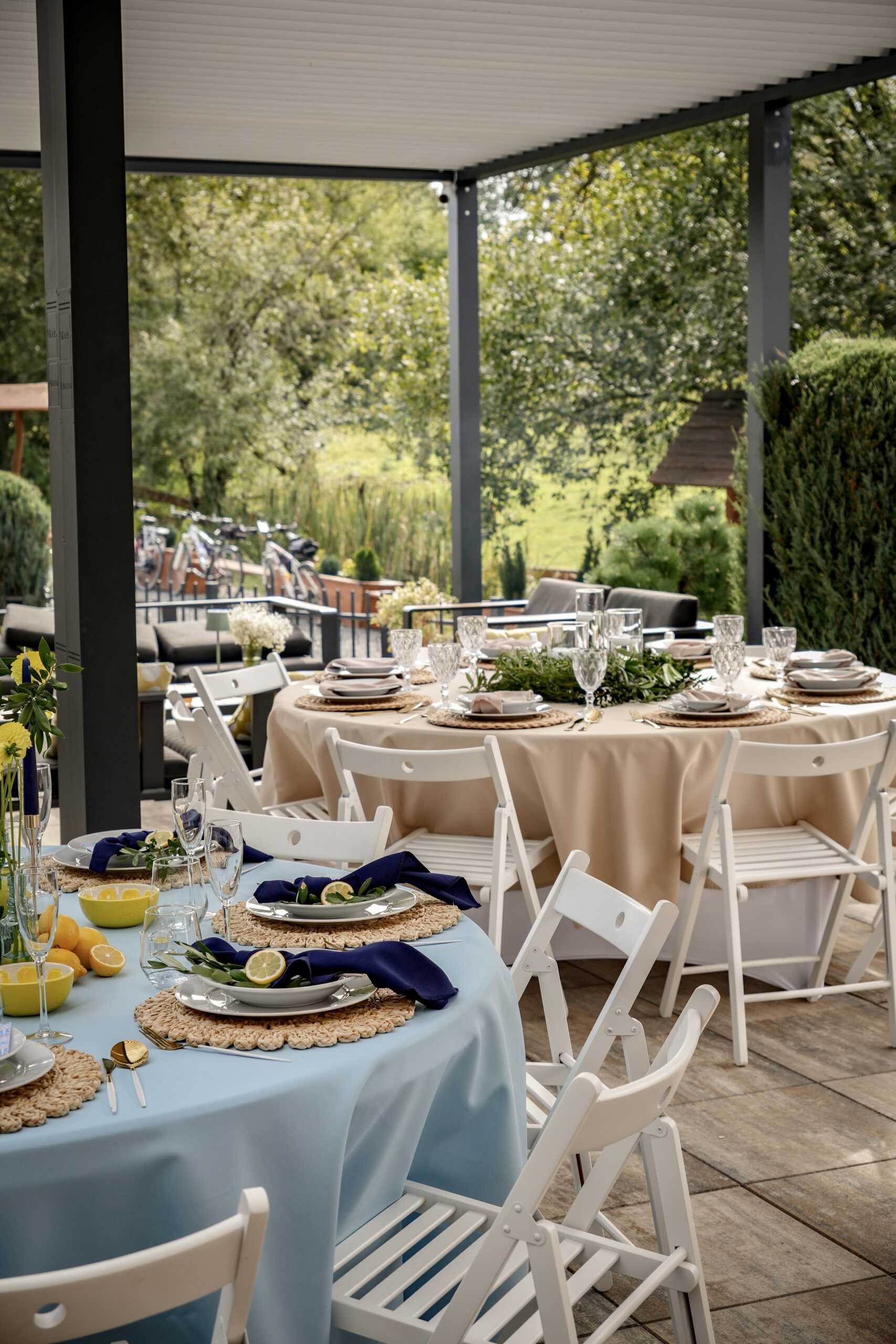 kompletní mobiliář – stoly, židle, jídelní servis, příbory i sklo,