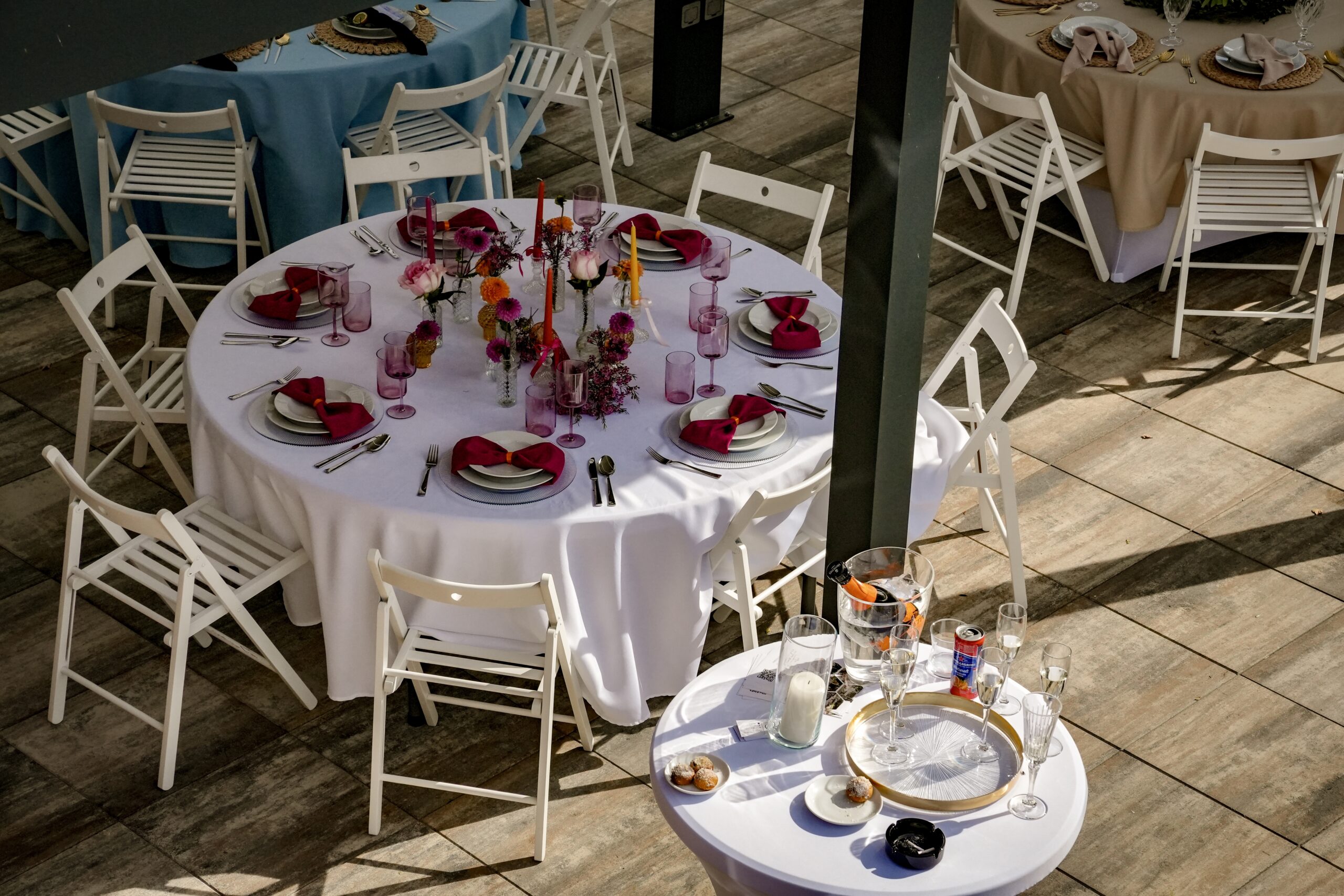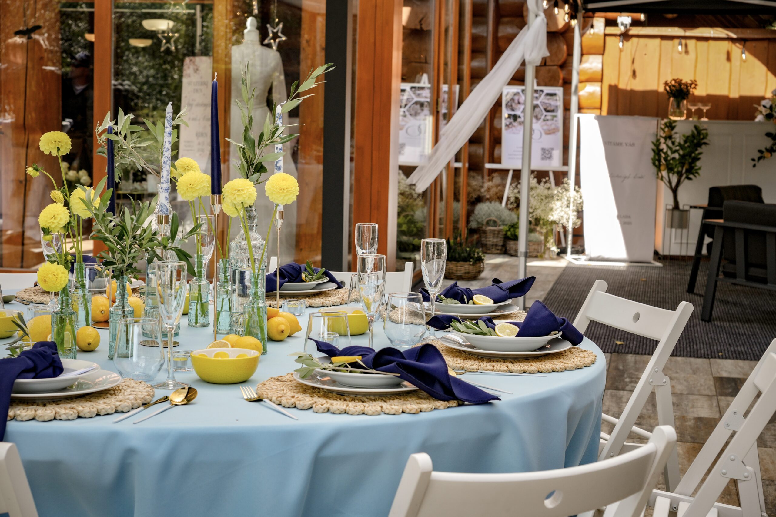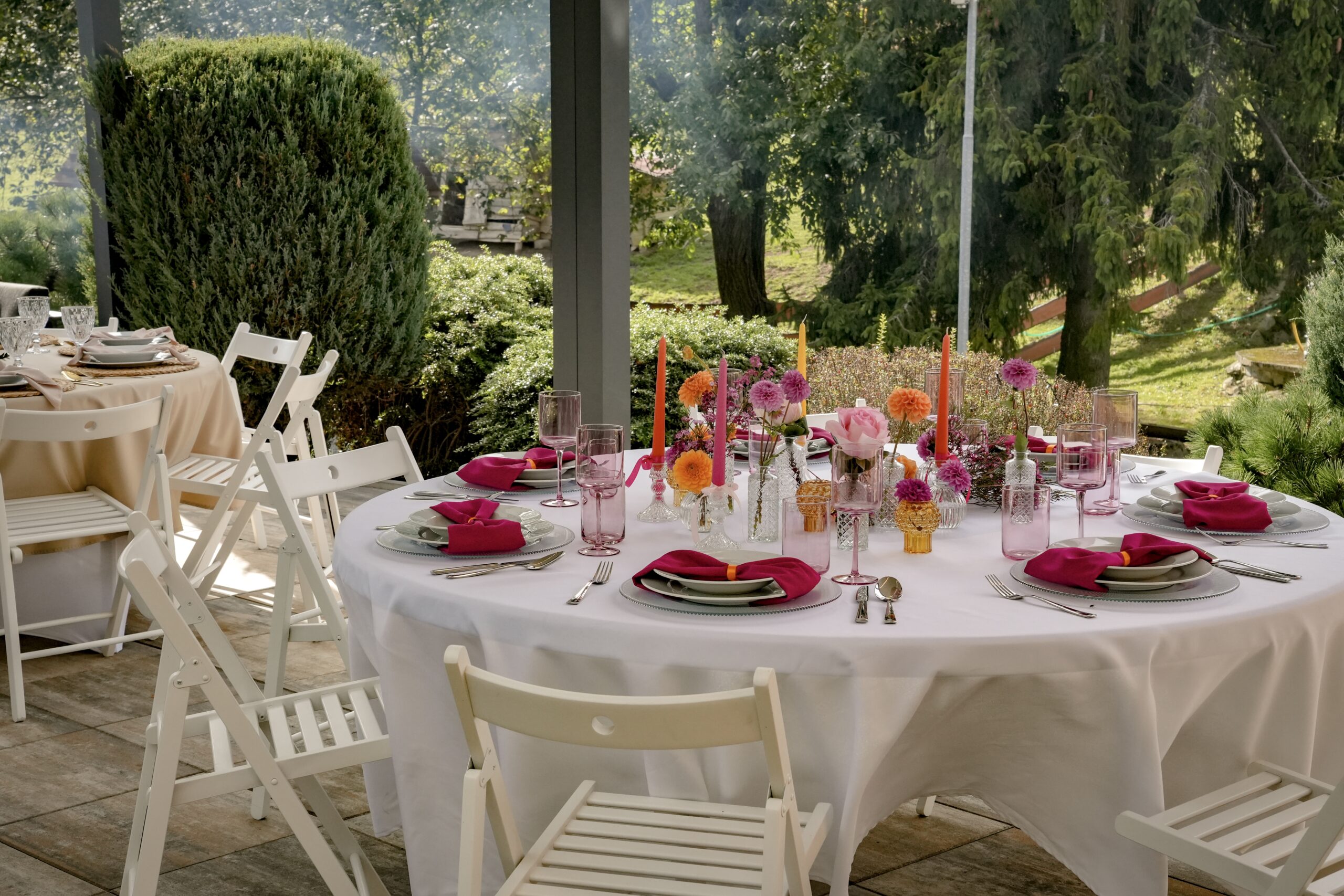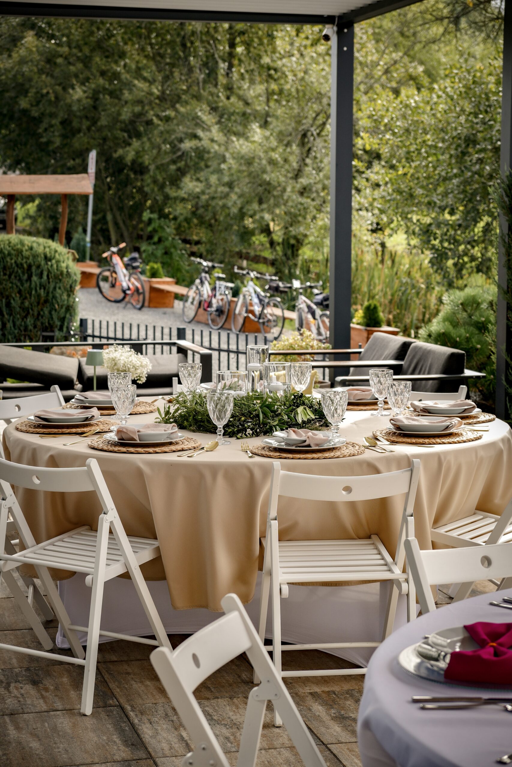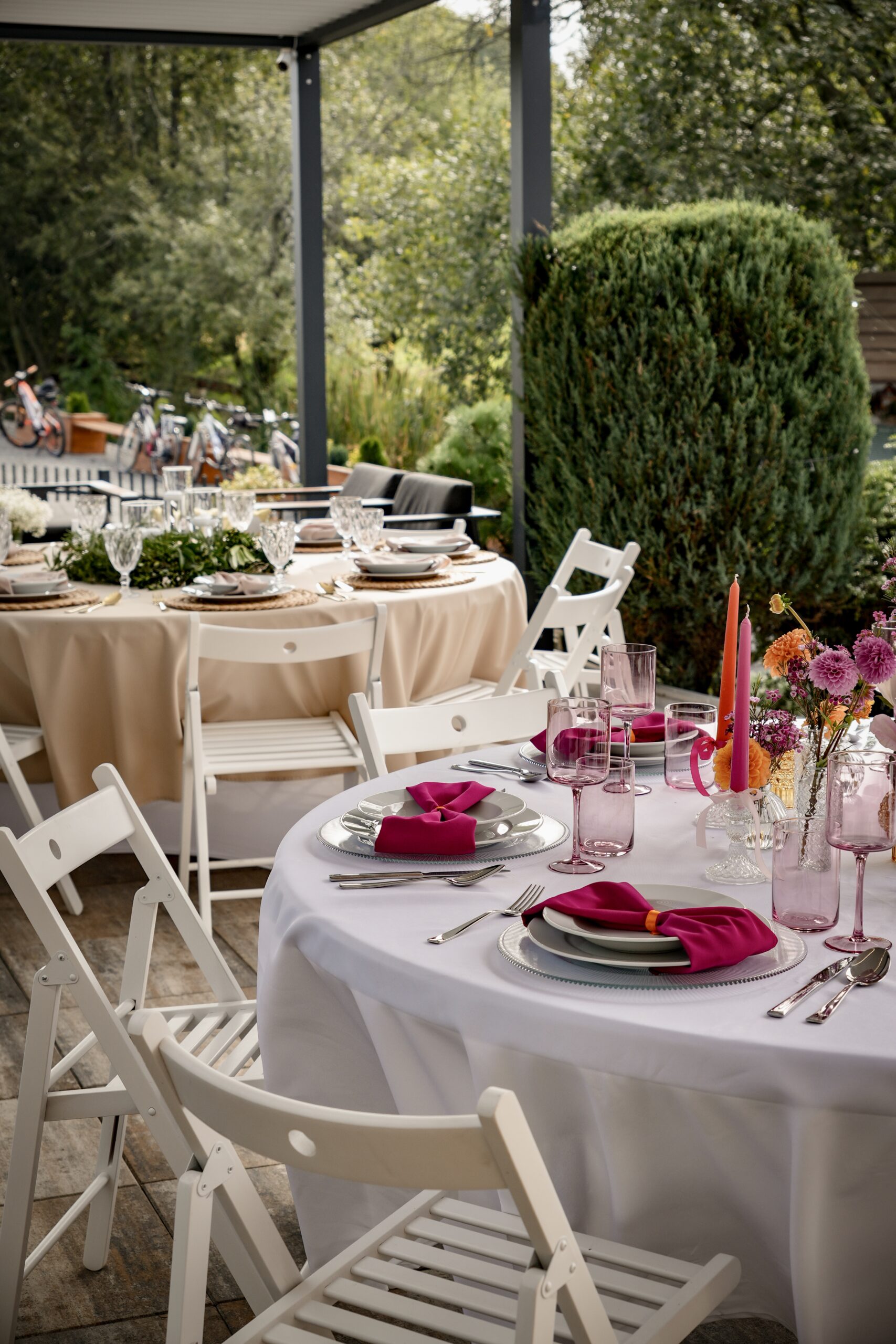 kompletní mobiliář – stoly, židle, jídelní servis, příbory i sklo,