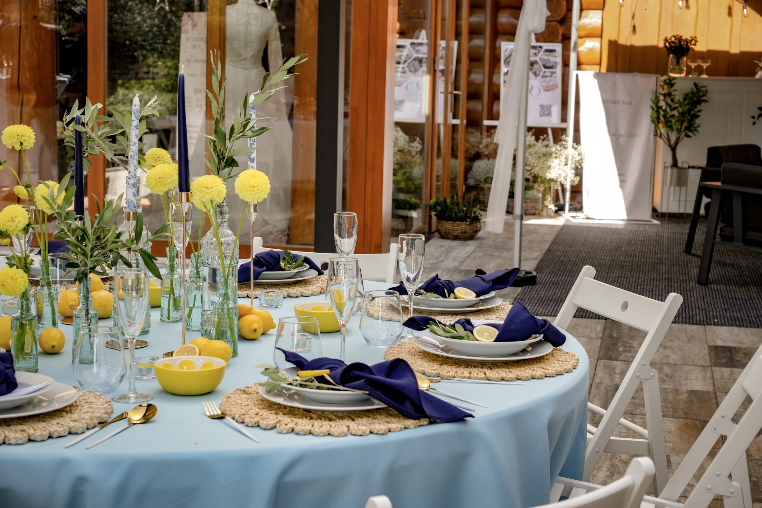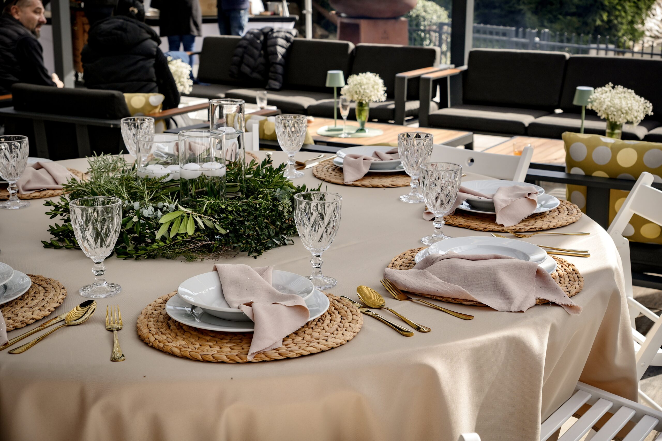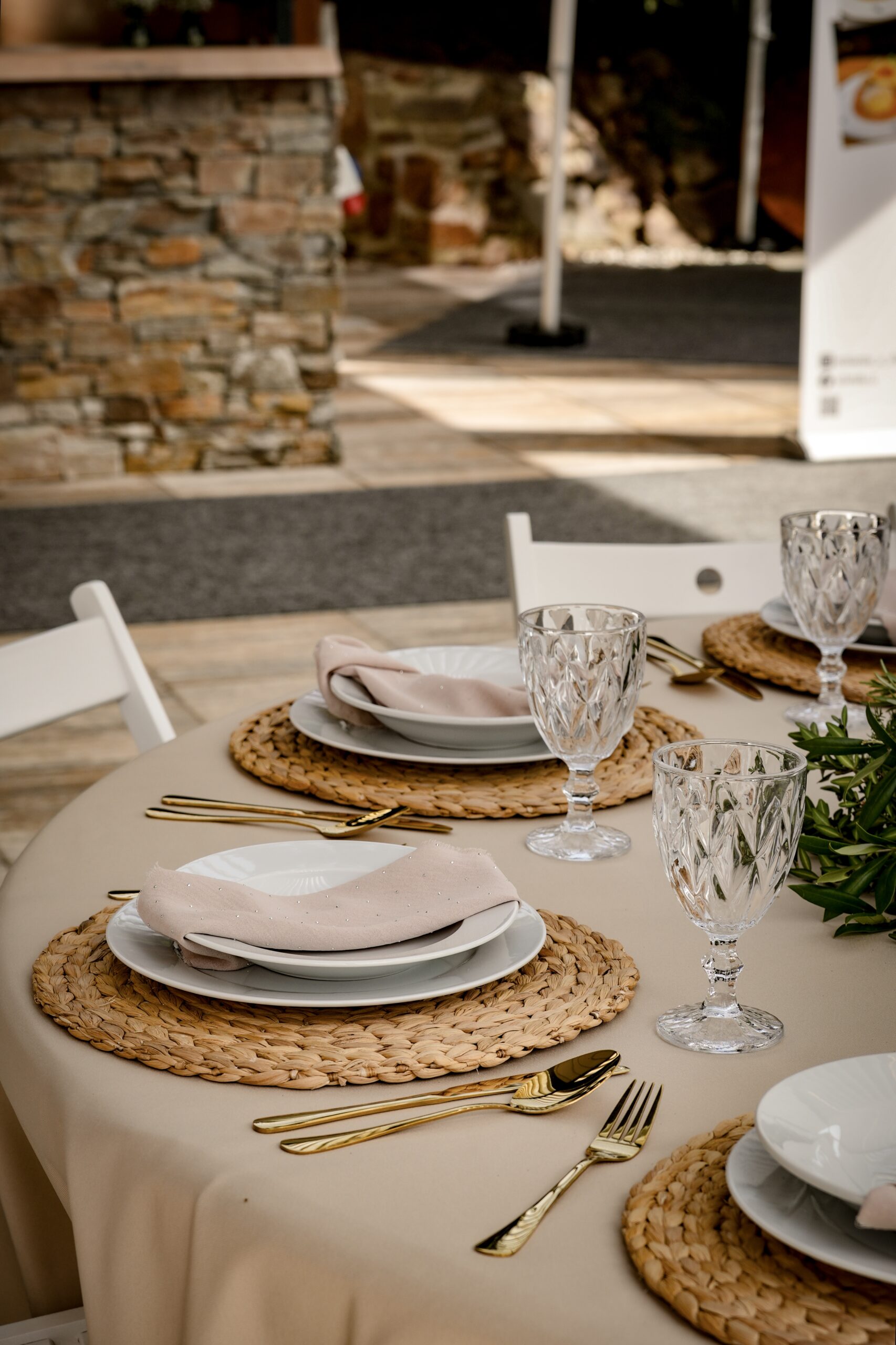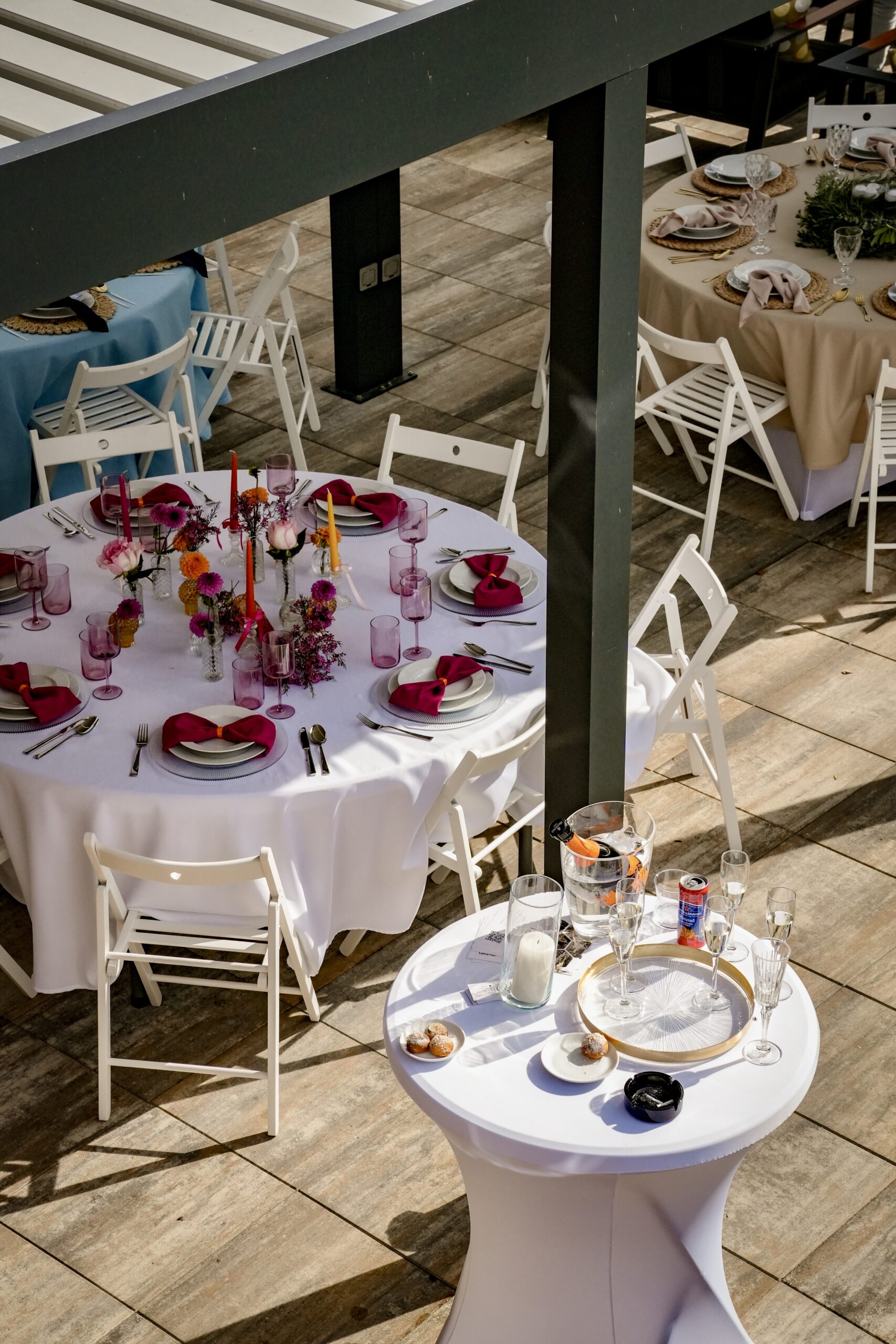 kompletní mobiliář – stoly, židle, jídelní servis, příbory i sklo,