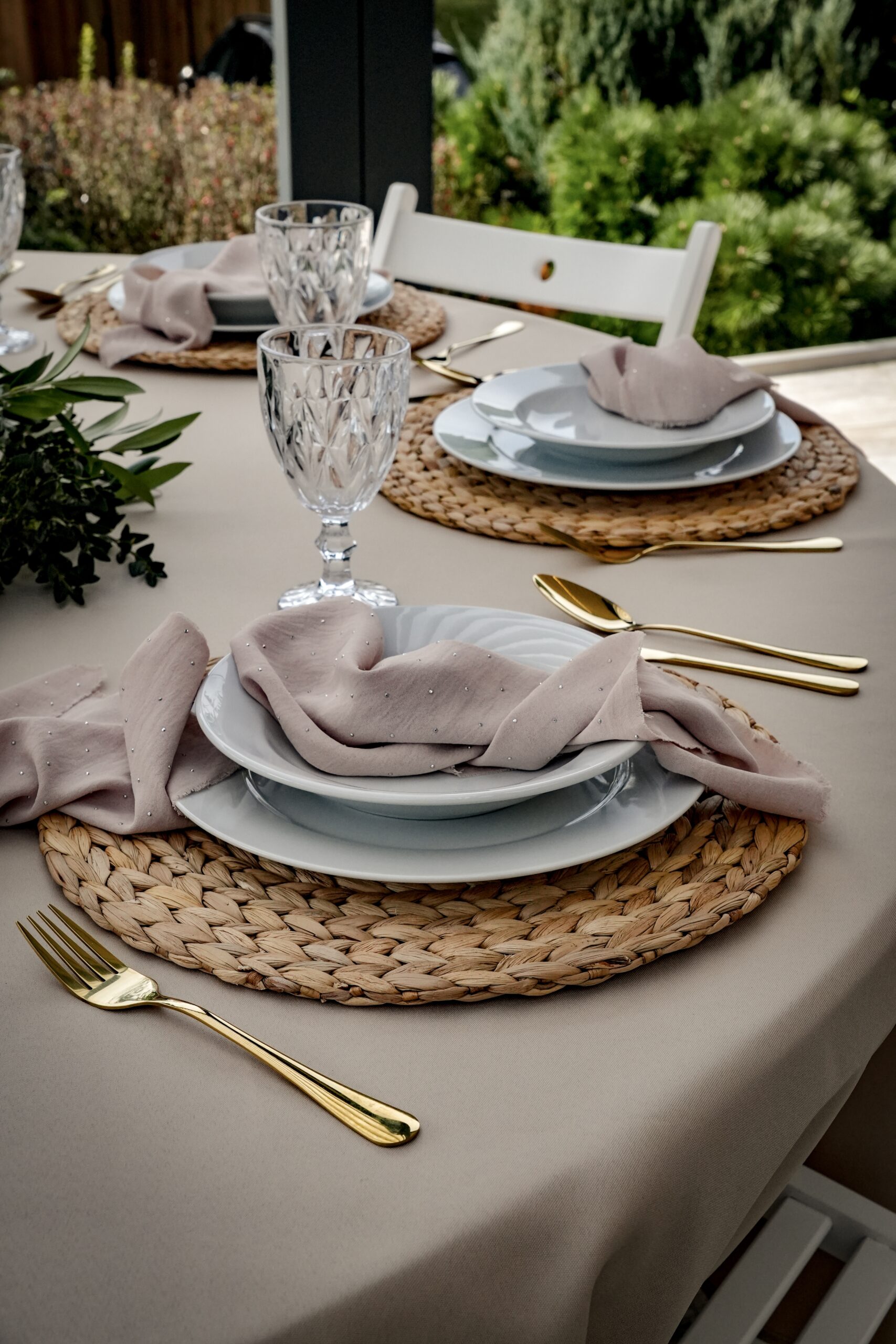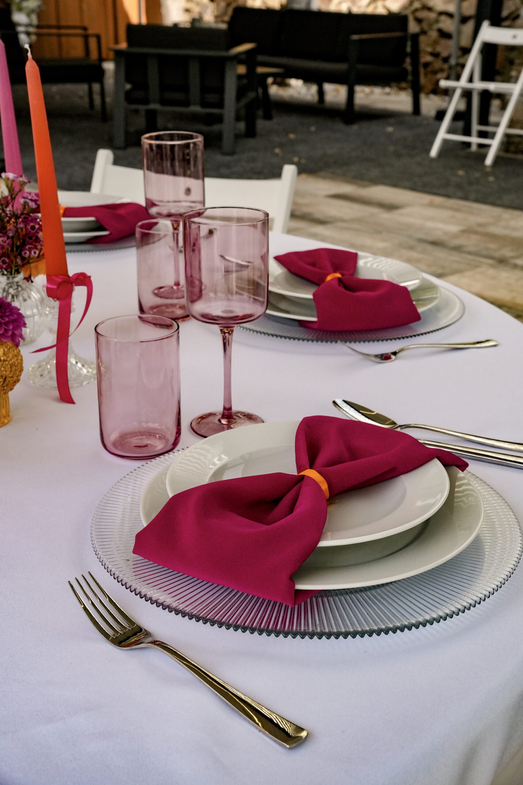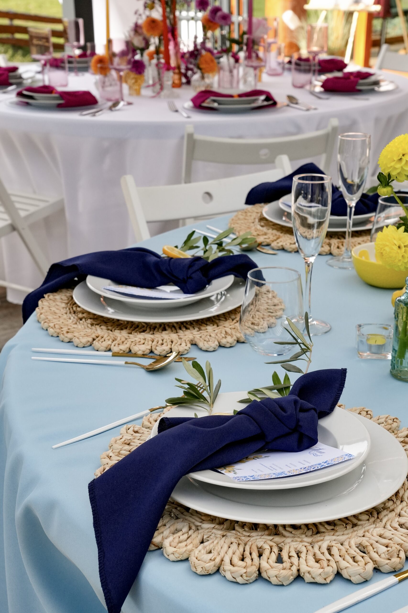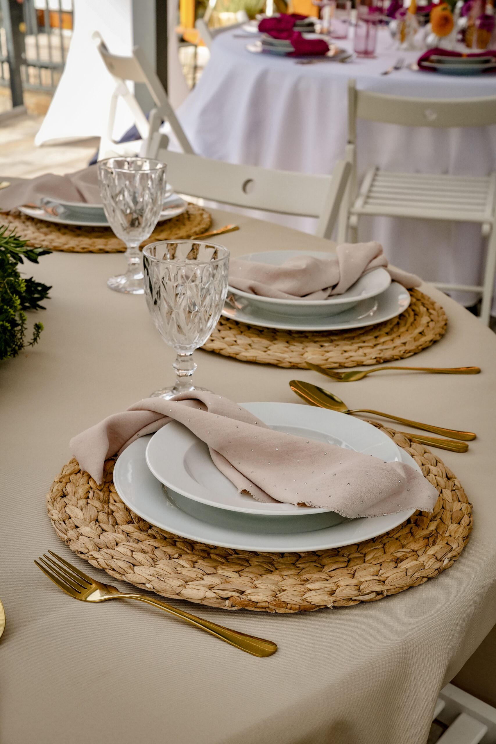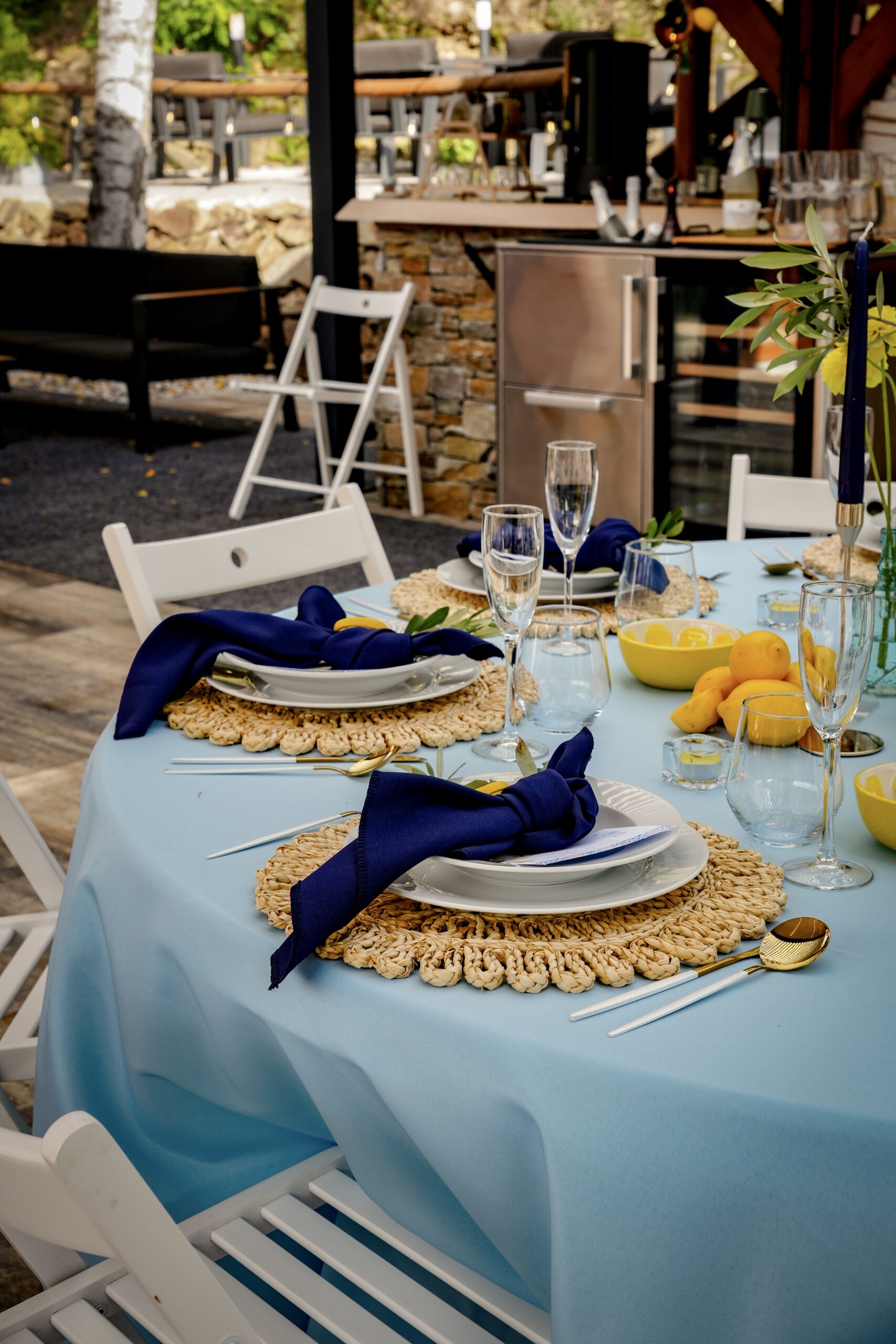kompletní mobiliář – stoly, židle, jídelní servis, příbory i sklo,